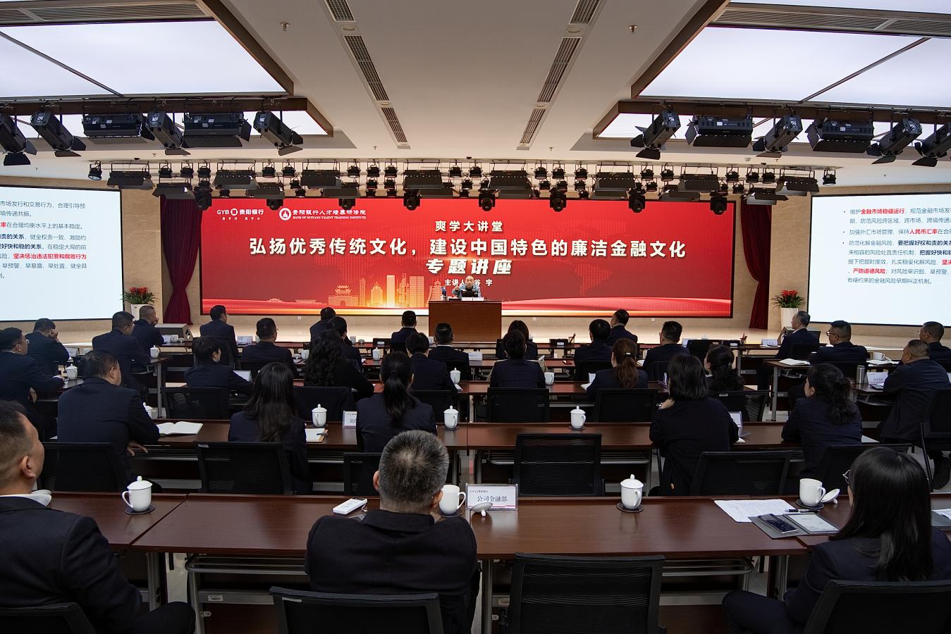 为大力弘扬中华优秀传统文化,积极培育中国特色金融文化,加强新时代廉洁文化建设。10月23日,贵阳银行举办以“弘扬优秀传统文化,建设廉洁的金融文化”为主题的专题讲座,邀请中共上海市委党校(上海行政学院)党的建设教研部教授谷宇进行授课。贵阳银行领导班子、各分支机构、总行各部门中层助理及以上管理人员及统战人士代表230余人参加。