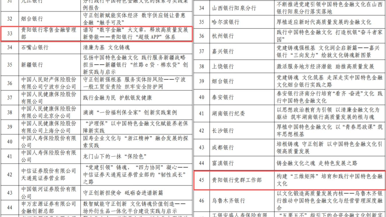 贵阳银行此次入选的两个案例,分别从数字化转型与文化培育两个维度,展现了在践行中国特色金融文化守正创新及文化建设方面的探索成果,彰显了地方金融国企在服务实体经济、防控金融风险、深化金融改革中的责任担当。