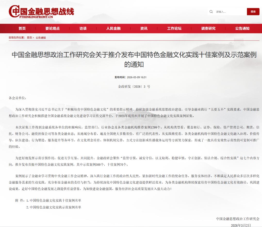 据悉,此次发布的名单为首批中国特色金融文化实践案例。该案例征集活动于2025年底启动,主要围绕“五要五不”实践要求收集到来自全国监管部门、行业协会及各类金融机构报送的案例1299个,其中示范案例500个、十佳案例70个。最终入选的十佳案例及示范案例,集中展示了全国金融系统在践行中国特色金融文化方面的创新探索与显著成效。